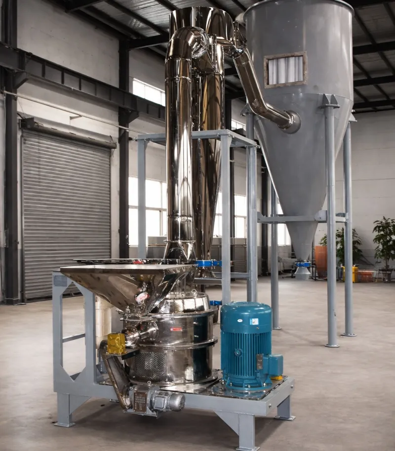 - Integrated Precision Classification: The built-in high-speed air classifier wheel operates synchronously with the grinding rotor. It ensures that only particles meeting the exact d99= 92.8μm target can pass through, recycling coarse particles instantly for re-grinding without over-milling the fines.